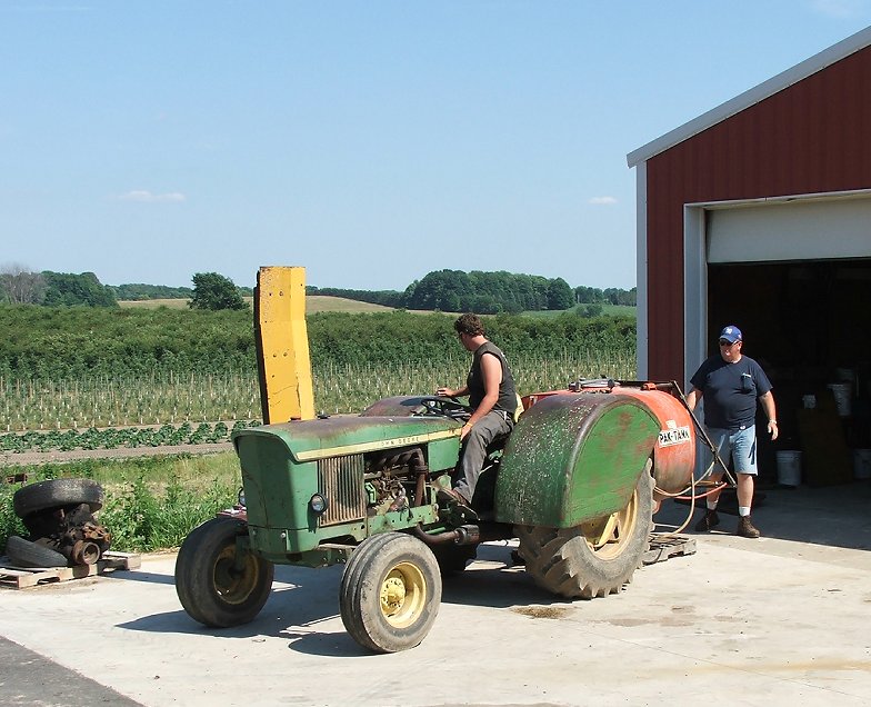 Jack King and Jim King with tractor and water tank at the home farm. In the background are raspberries, pumpkins, Honeycrisp apples staked and trellised, Gala apples on dwarfing rootstock, and then Montmorency tart cherries in the back and up the hill. At the left is a modern art sculpture by Casey, featuring worn out tires and transmissions.
